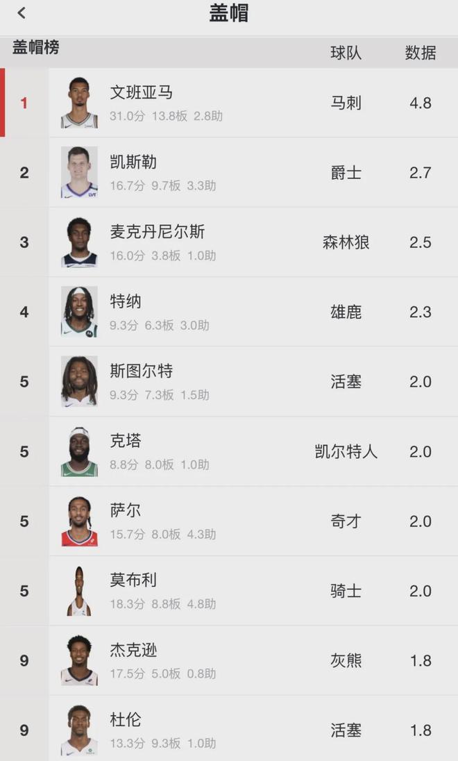 开季至今,文班亚马打了4场比赛,一共送出19记盖帽。场均4.75记盖帽,高居联盟第一。联盟第二是凯斯勒(2.7记盖帽),第三是麦克丹尼尔斯(2.5记盖帽)。文班亚马绝对是遥遥领先,没有人能撼动他盖帽王的位置。